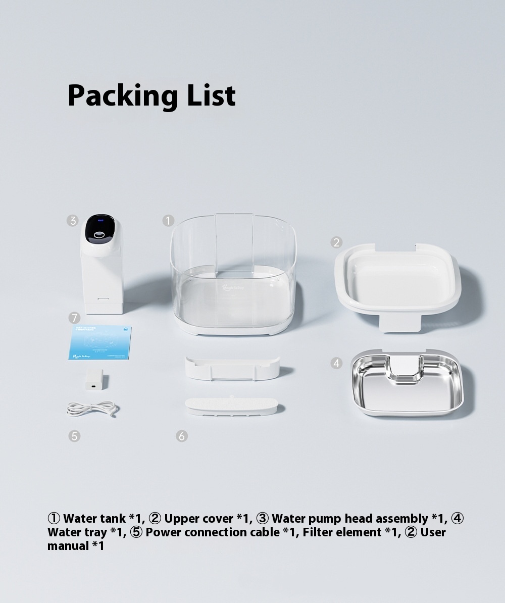 Water tank * 1, Upper cover * 1, Water pump head assembly * 1, Water tray * 1, Power connection Line 1, Filter element 1, User manual 1
